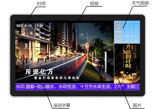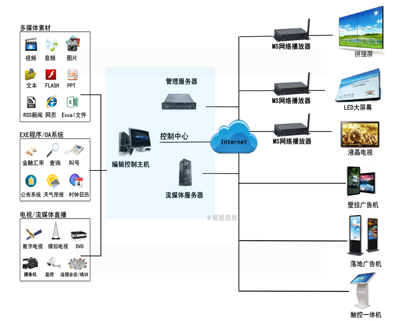 視頻、圖片、文本(滾動(dòng)字幕)等多媒體文件上傳至服務(wù)器,制定各種多媒體組合播放內(nèi)容, 下發(fā)給各顯示終端,可設(shè)定循環(huán)、定時(shí)、定次、插播、墊片、流媒體直播等播放方式。
