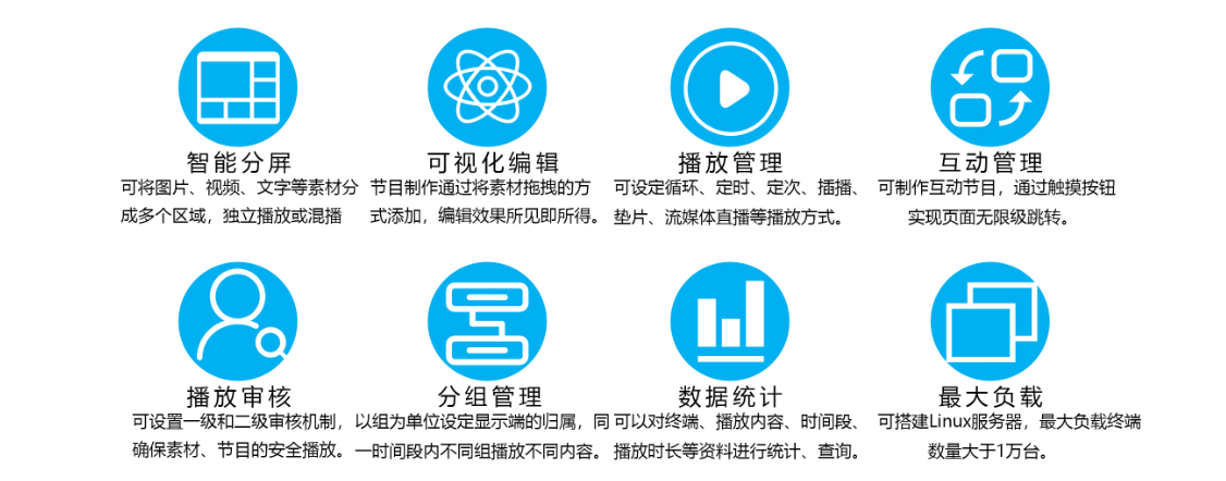 可搭建Linux服務(wù)器;最大負(fù)載終端數(shù)量大于1萬(wàn)臺(tái);支持多點(diǎn)同步播放;支持電視信號(hào)輸入。
